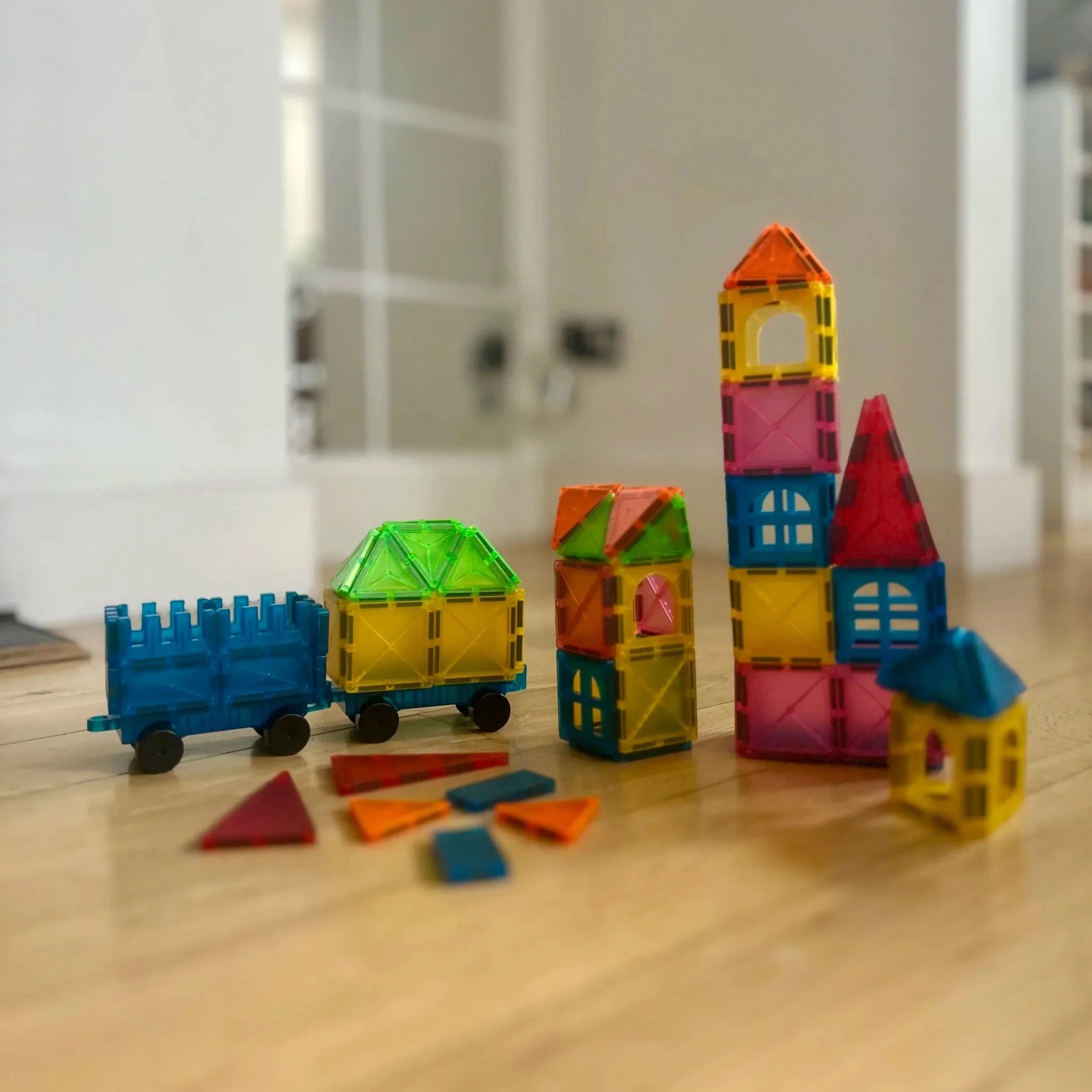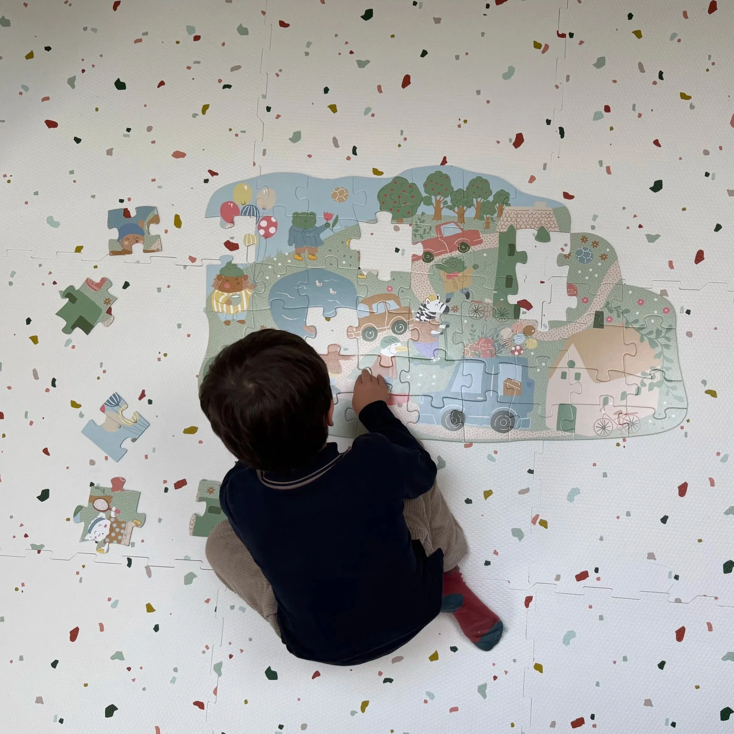 A young girl with curly hair and hair clips, sitting on a terrazzo floor and playing with animal-shaped puzzle pieces and toys.